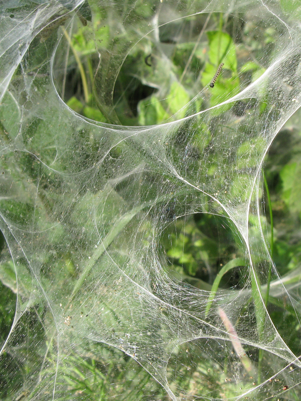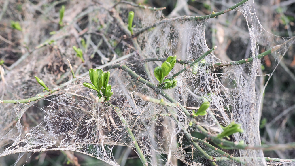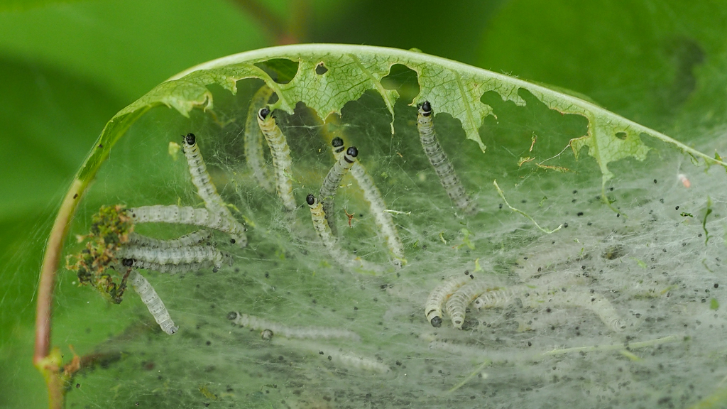 Samen spinnen de rupsjes huisjes van samengesponnen blaadjes, die ze razendsnel opeten