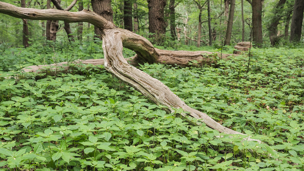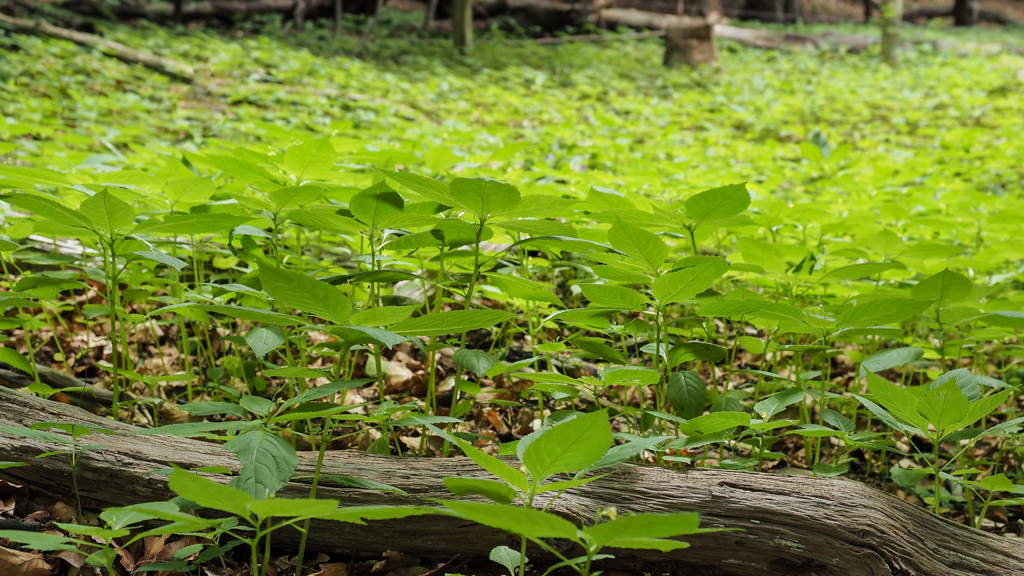 Teergroene tapijten van springzaad in de schaduw van bomen en bossen: