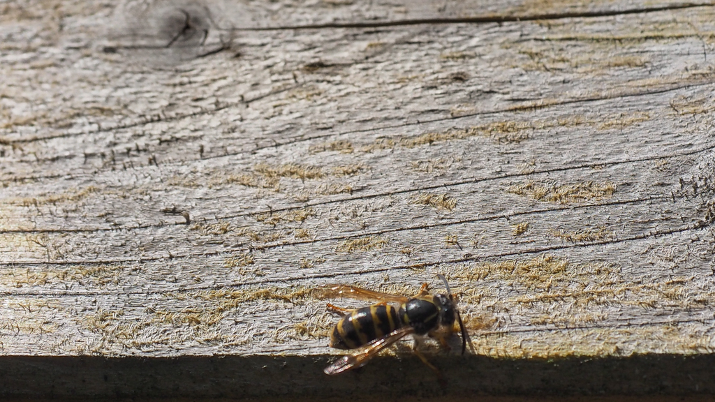 Deze Franse veldwesp aast op hetzelfde kale hout als bouwmateriaal,