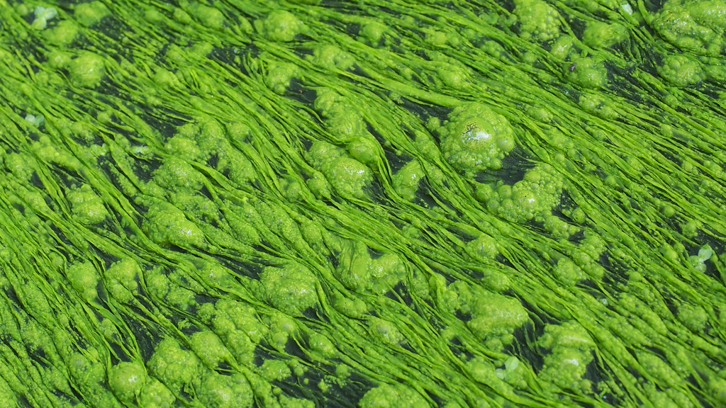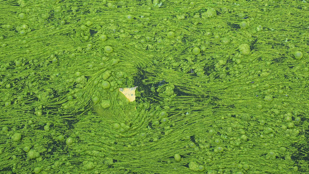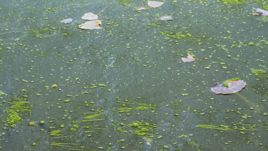 Als in de zon moerasgasbelletjes opstijgen, en ook de groene algen