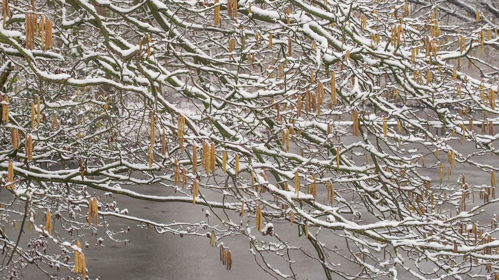En in de boom hieronder blijven alle schubben nog stevig winter-dicht.