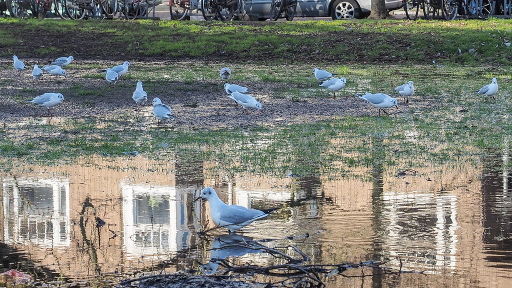 Hetzelfde stadsgrasveldje (zie week 4), ondergelopen, bevroren en weer ontdooit: