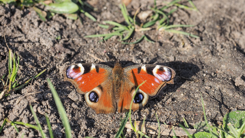 Soorten: Kleine vos (op Klein hoefblad), 2x Dagpauwoog, Gehakkelde aurelia.