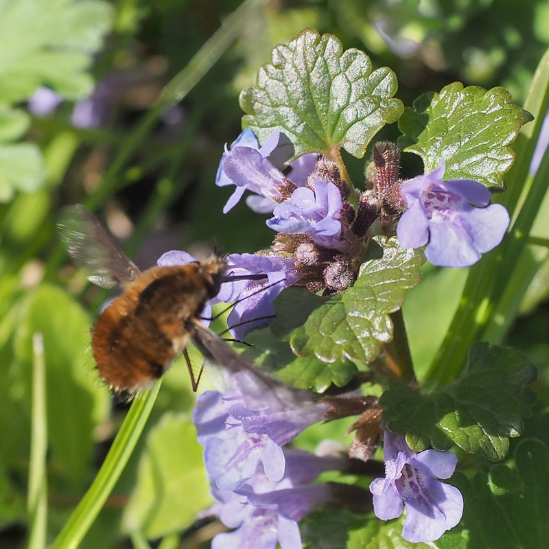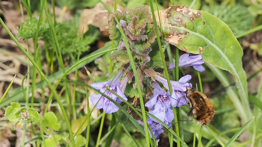 met hun lange tong uit die diepe bloempjes (van hondsdraf) nectar te zuigen.