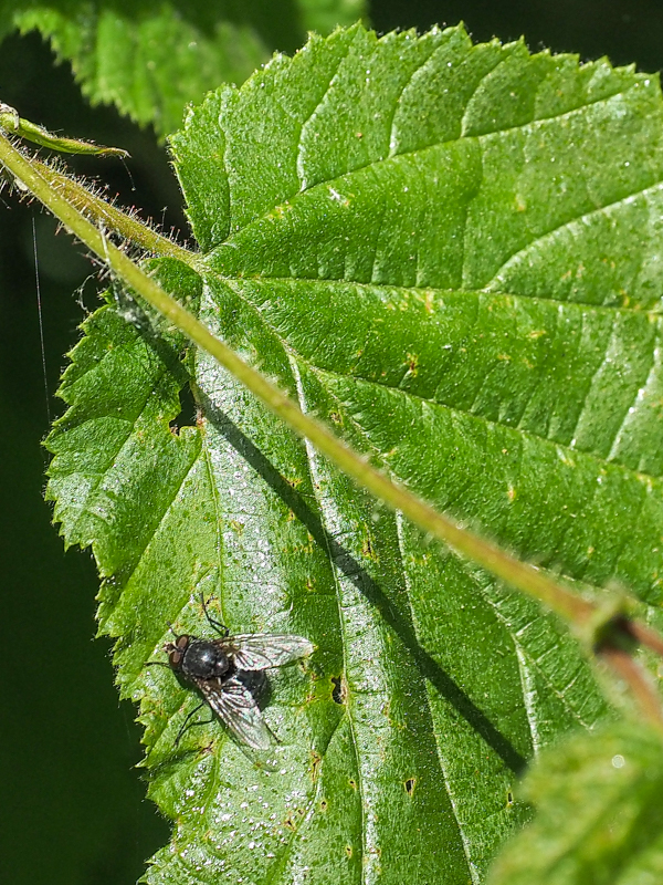 Kijk hoe (zweef)vliegen de honingdauwdruppeltjes opzuigen van hazelaarblad,