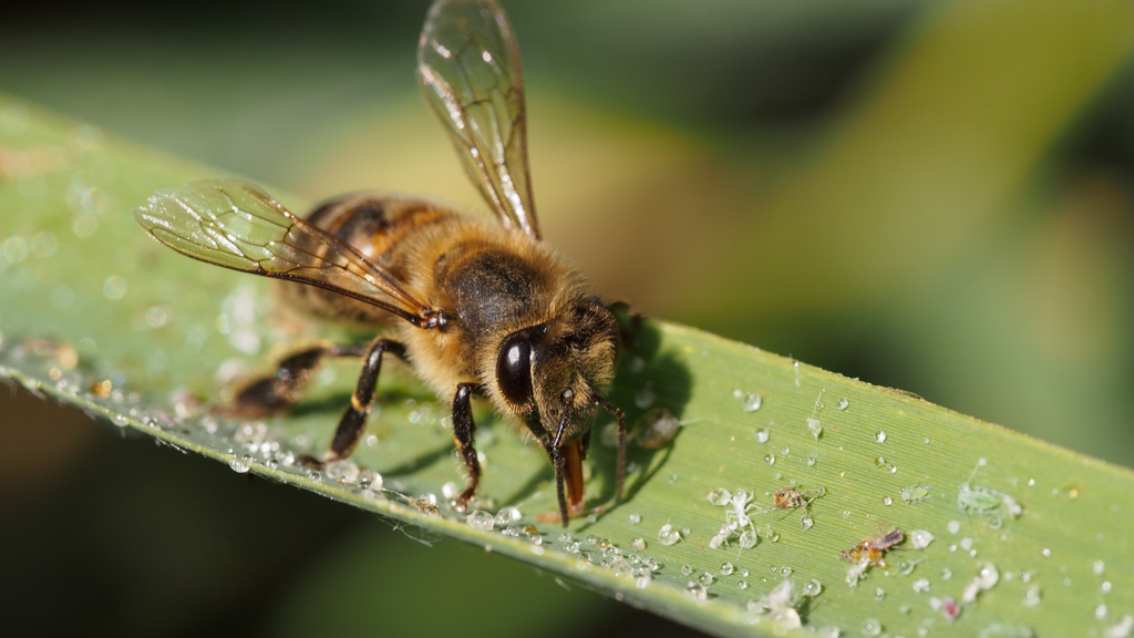 aan de onderkant hun zuigsnuit in de nog zachte bladnerven te steken,