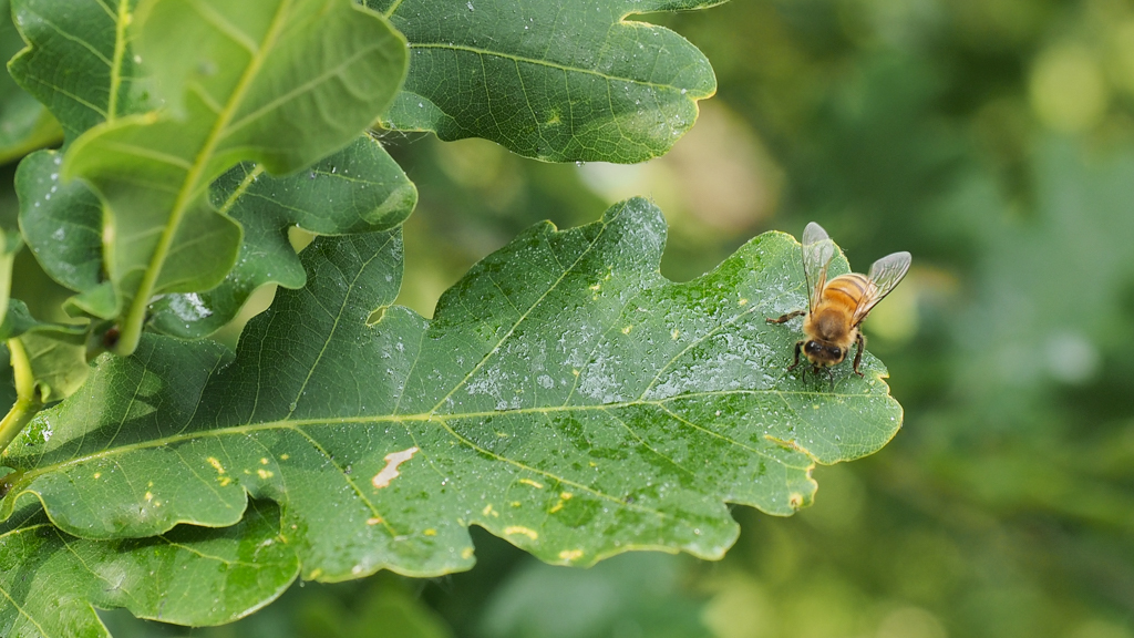 terwijl hommel en bij die oplikken met hun lange tong, van eikenblad en riet.