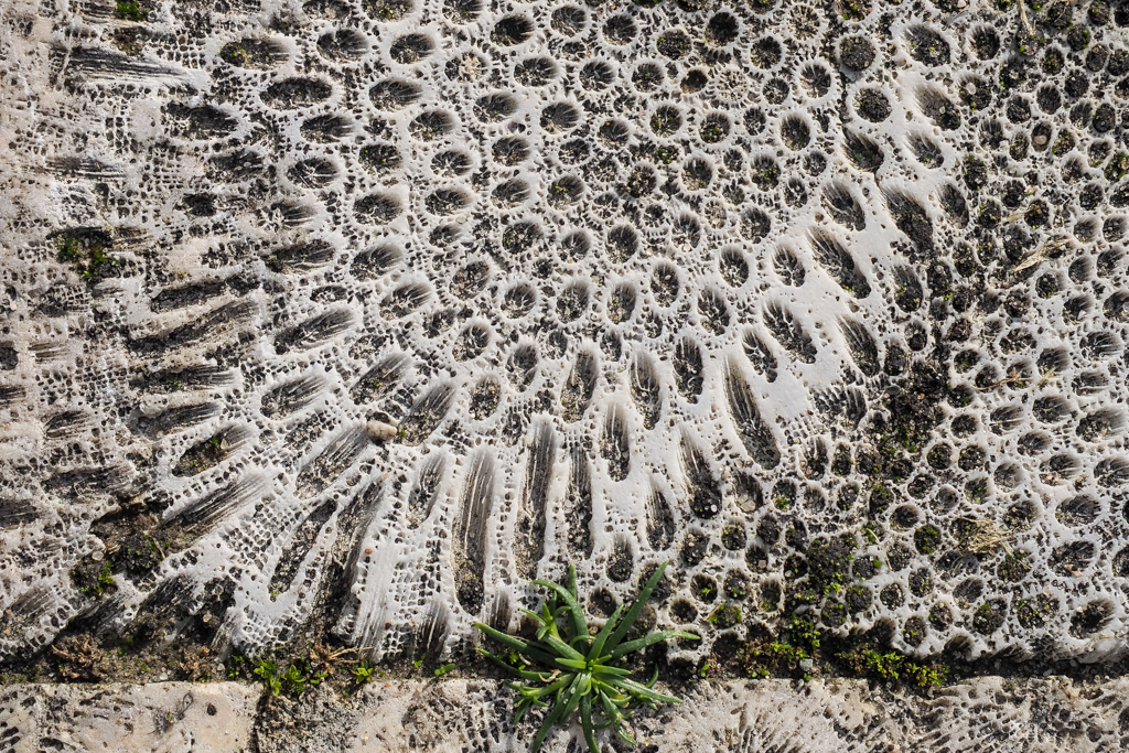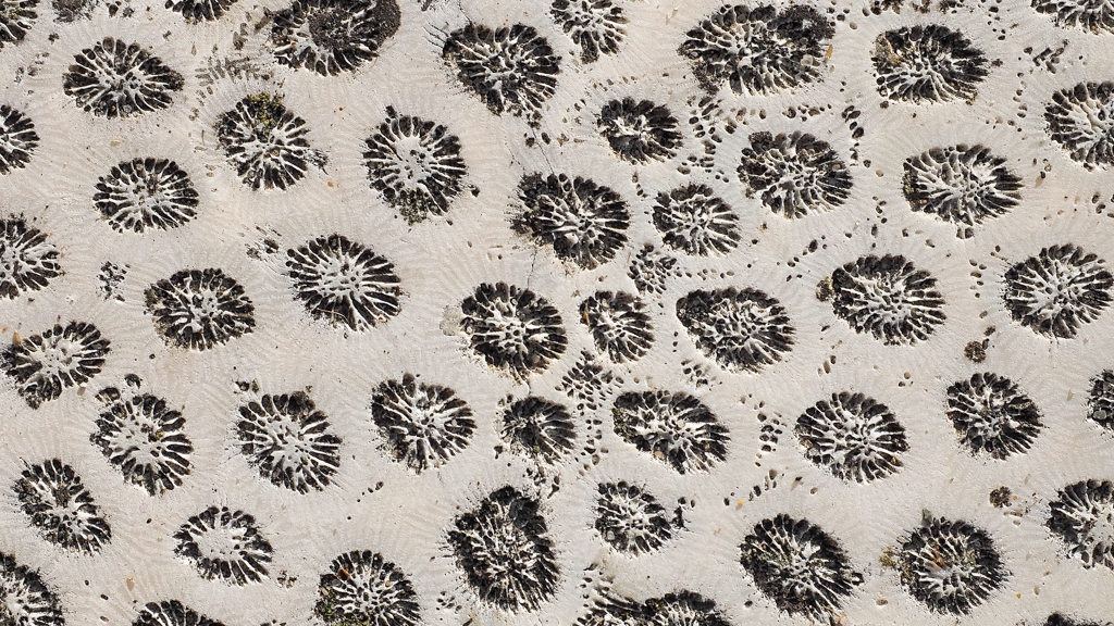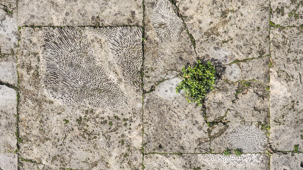 zijn verzaagd tot terrastegels waarin je hun bouw in doorsnedes nog kunt zien: