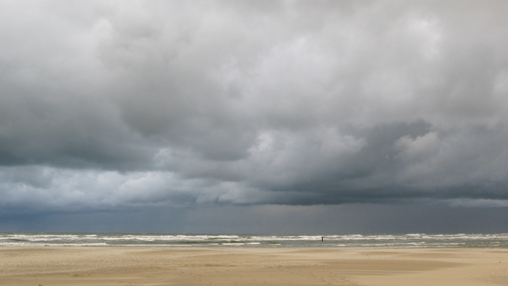 of het bijna egaal donkere regengordijn tot op de golven.
