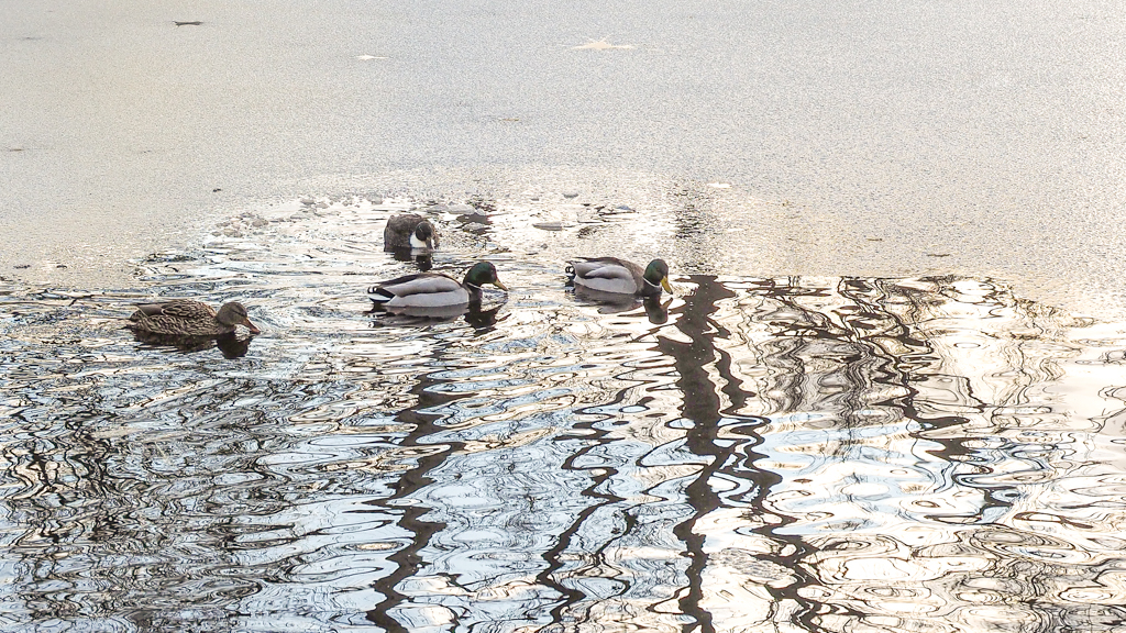 maar de eenden hebben het fel spiegelende smeltwater al gevonden.