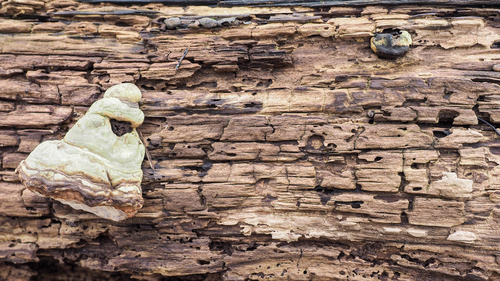 In een verse boom, nog beschermd onder wat bast, vinden de schimmels