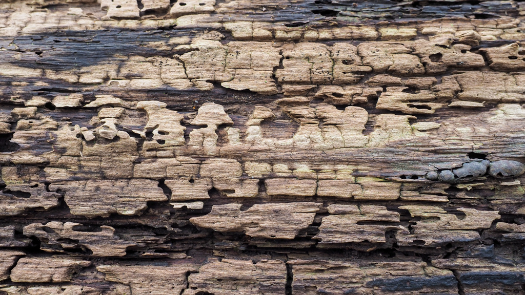 en resteert een fragiel mozaïek van bijna losse flarden en brosse brokjes hout.