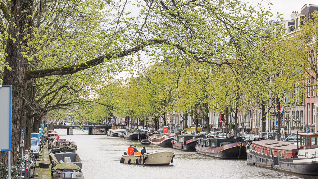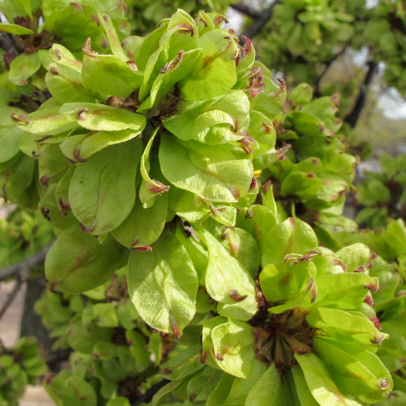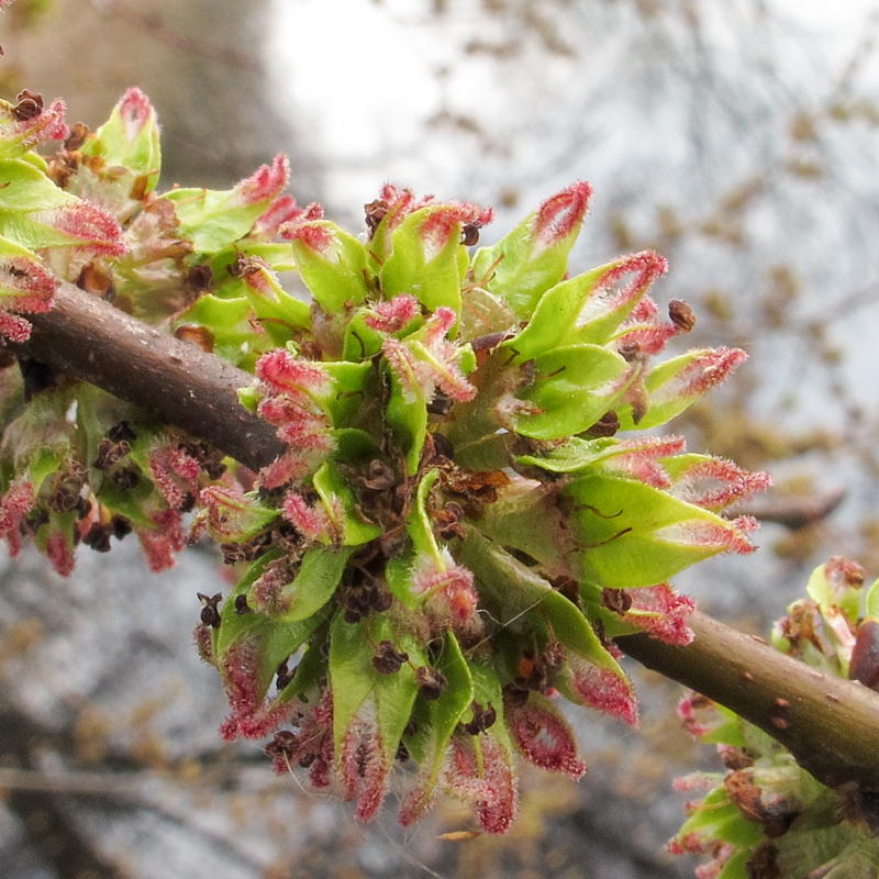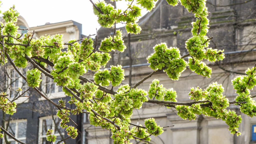 Nee, al deze stadse iepen staan nog niet in blad: ze zien (geel)groen