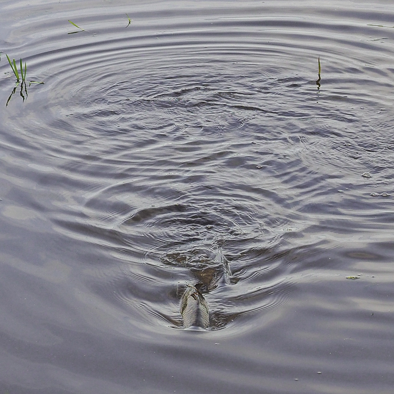 Eén topje rugvin dat nog wat golfringen trekt, of één rug die wat water wervelt: