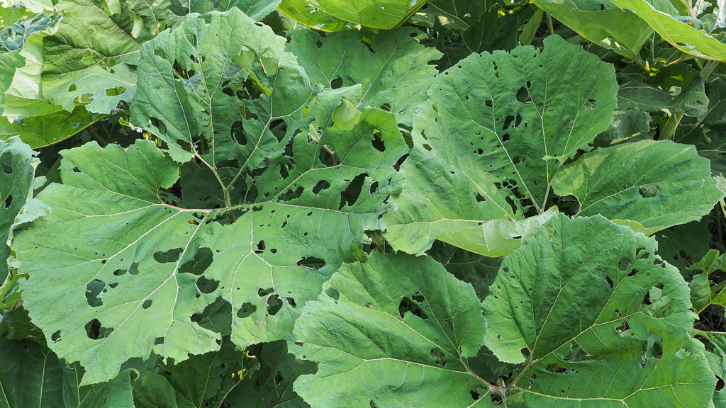 Zo snel vallen er alweer grote gaten in die grote stevige (hoef)bladeren: