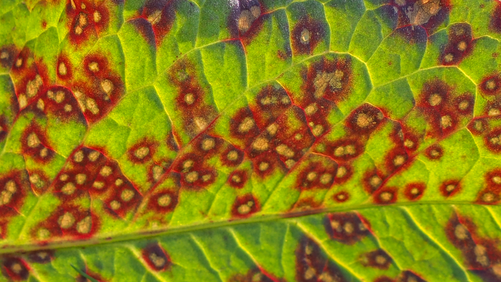 Kleurige patronen van aantasting en afweer, verlies en overleven.