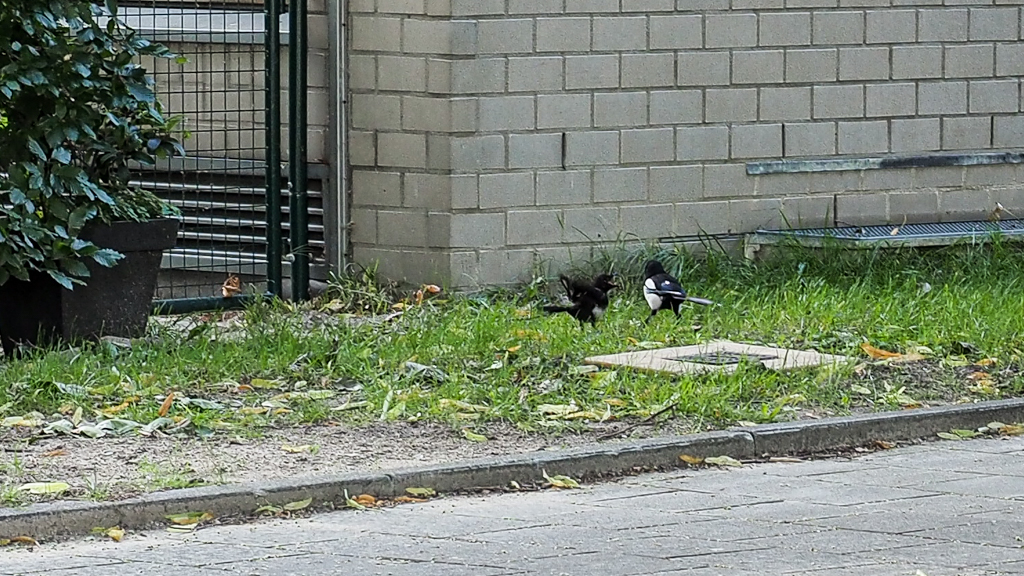 Dit bedelende eksterjong heeft minder geluk: de ouder vloog weg.