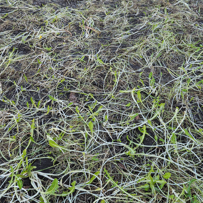 verse kiemplantjes en herstellende bladrozetten tussen dode grasresten,