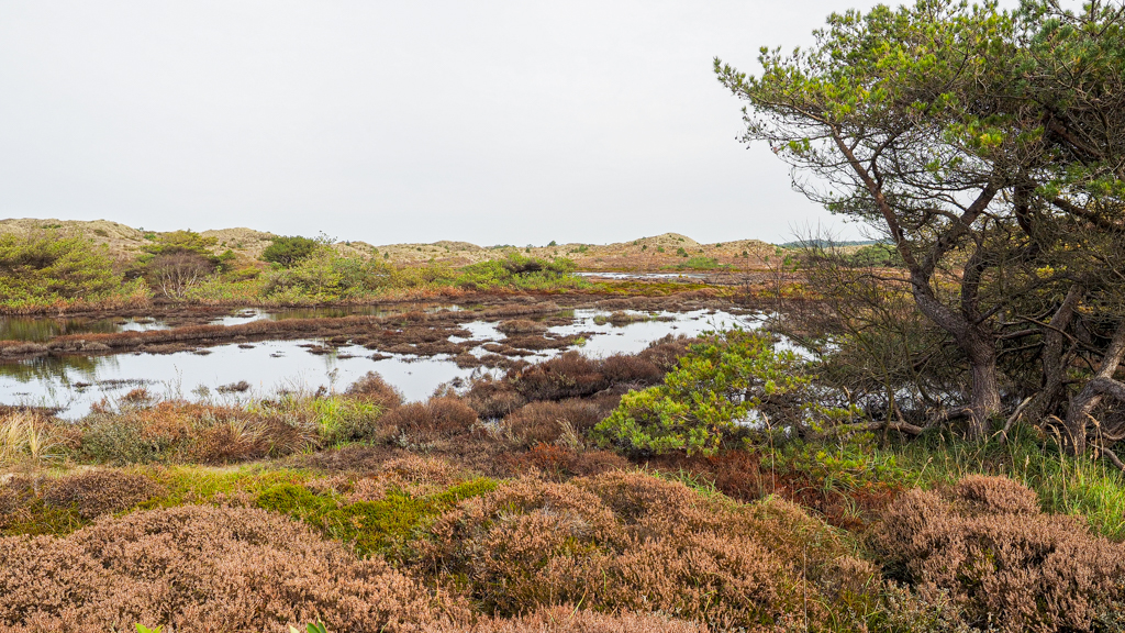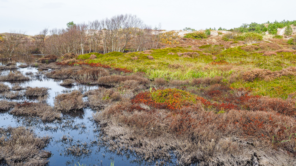 en hoe de hardgroene kraaiheide bij de waterrand al felrood verkleurt;