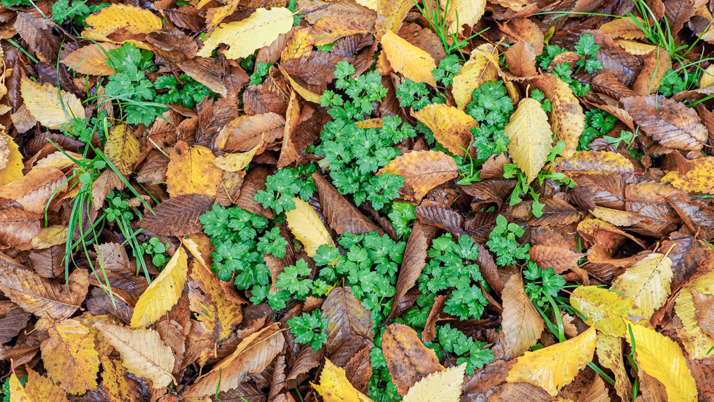 Tussen de nog vers geel gevallen bladeren staat zoveel vers groen: