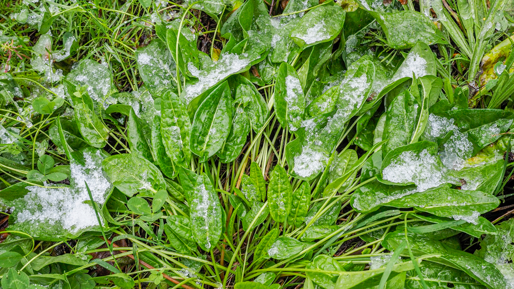 Zo’n pak natte sneeuw weegt wel zwaar op deze zuringbladeren, maar ook