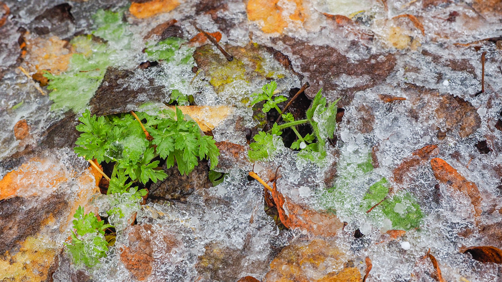 dit groen in papsneeuw en hagel heeft genoeg antivries om het te doorstaan.