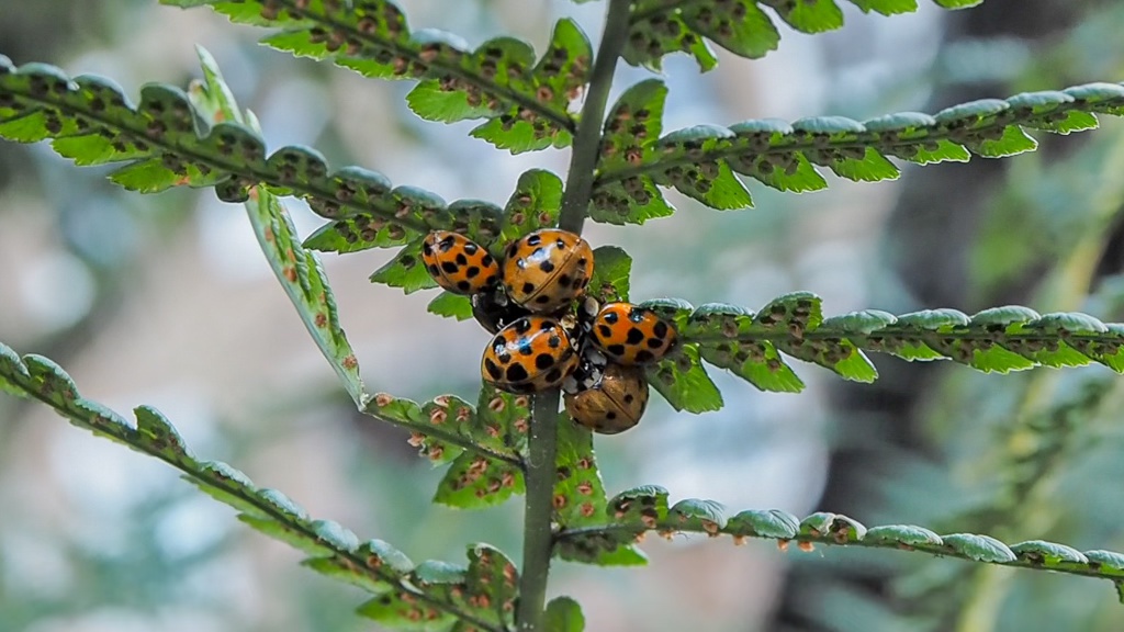 Hier schuilen lieveheersbeestjes, dicht op elkaar, onder een varenblad,