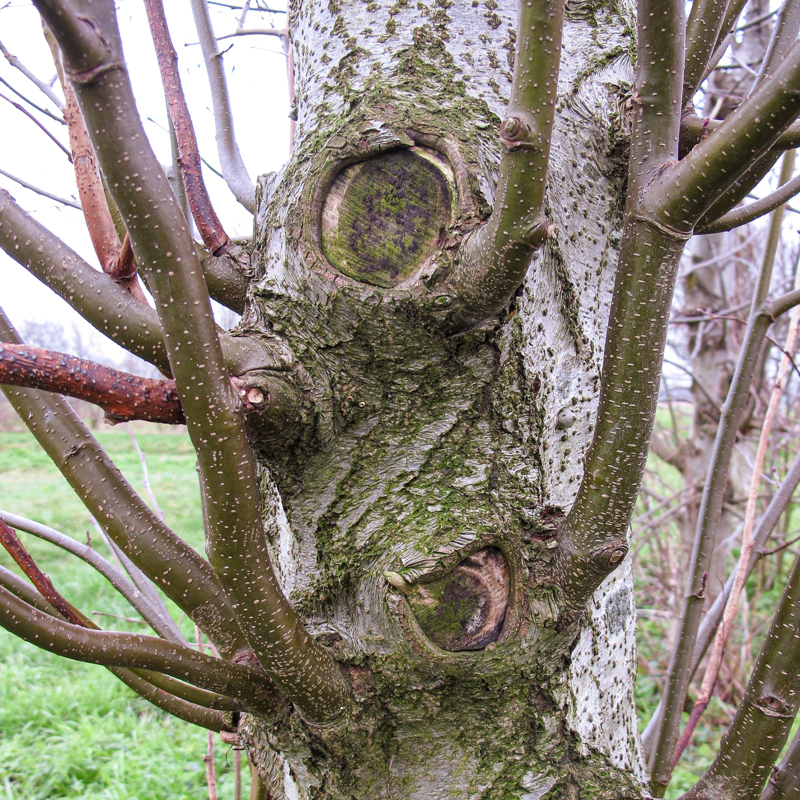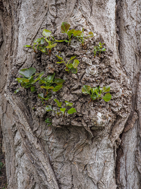 Op deze (Canadese) populieren lopen tussen alle oude tak-littekentjes