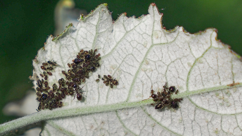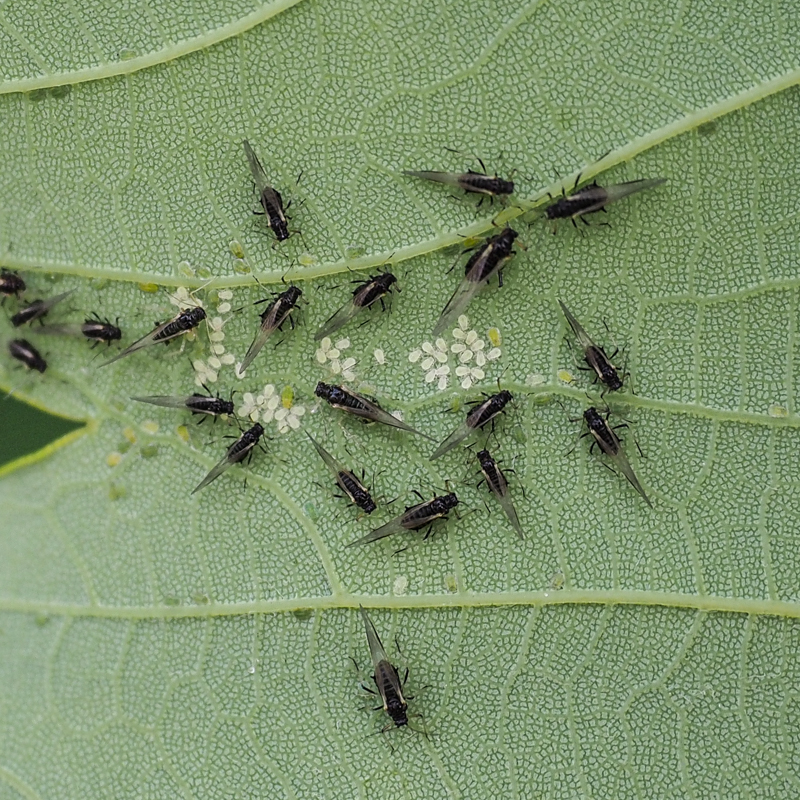 groeien ze snel uit, via groene nimfen tot die zwarte gevleugelde moeders: