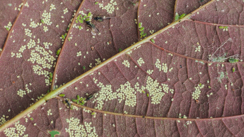 Als de esdoornbladeren uitlopen komen ook de overwinterde bladluiseitjes uit: