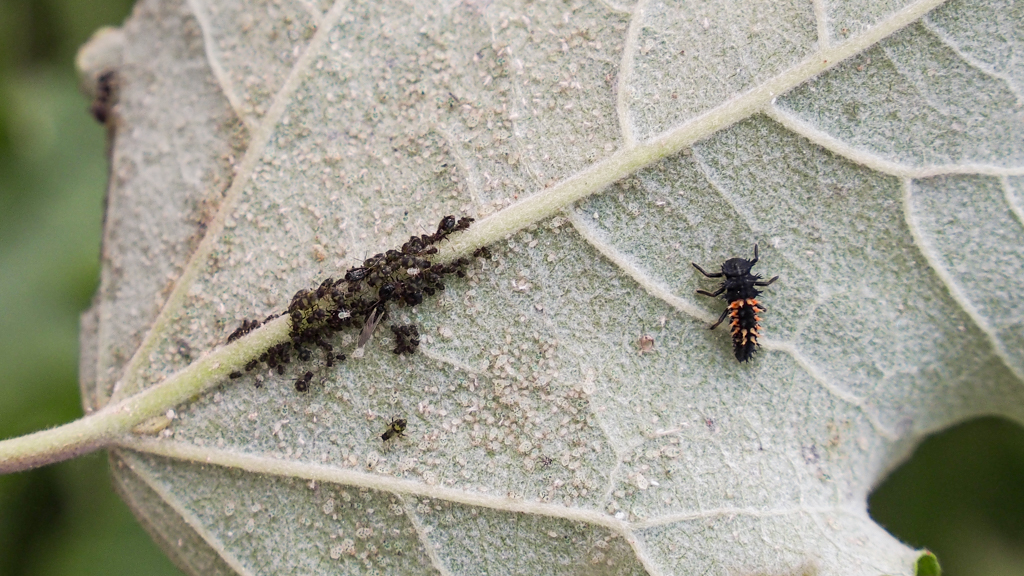 en de lieveheersbeestjes-larve lijkt het liefst de allerjongste bladluisjes te eten.