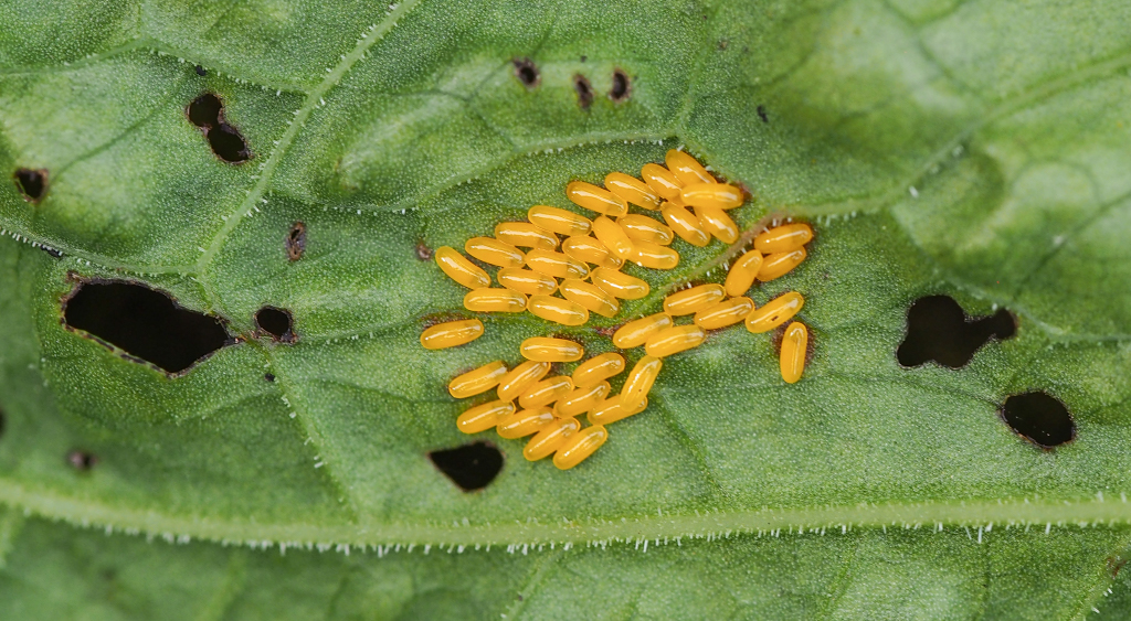 en leggen meteen al die eitjes (40 of meer!) onder tegen een zuringblad.