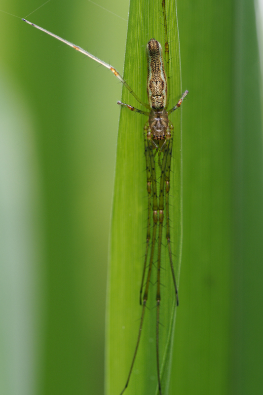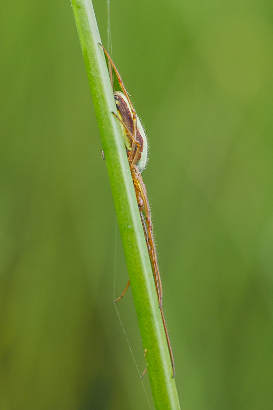 Met lijf en ellenlange poten strak tegen riet of stengel gedrukt