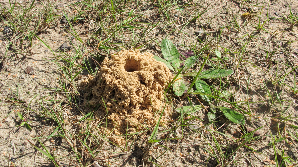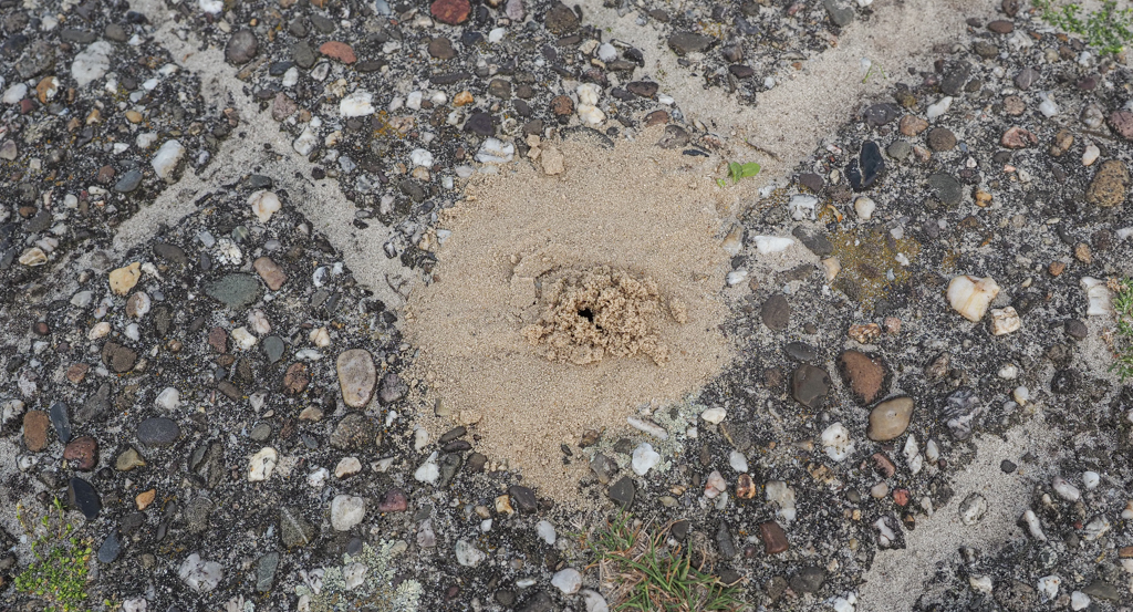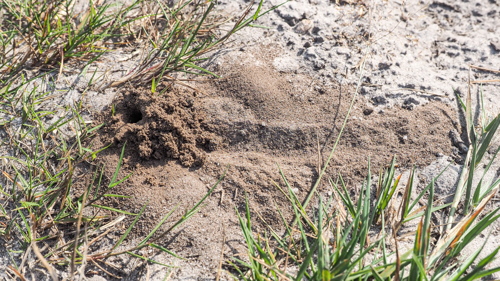 Ze krabt het zand losser met haar kaken en duwt het dan naar buiten.