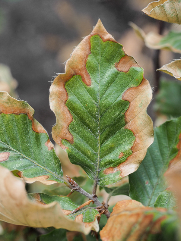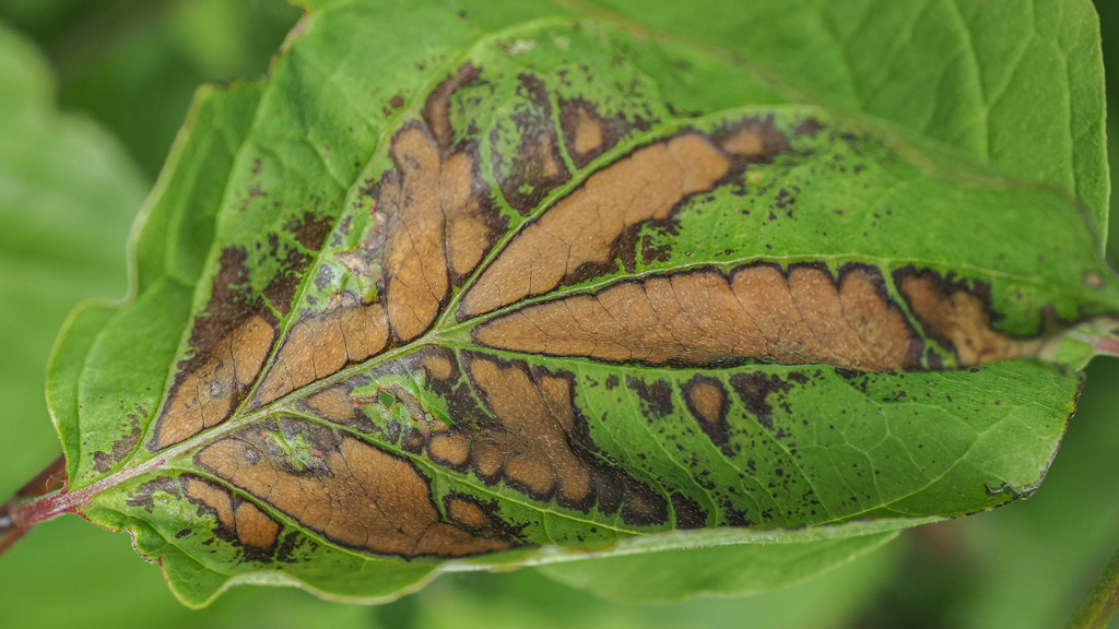 een mozaïek van bruin tussen frisgroene randen langs alle (lekkende?) nerven.