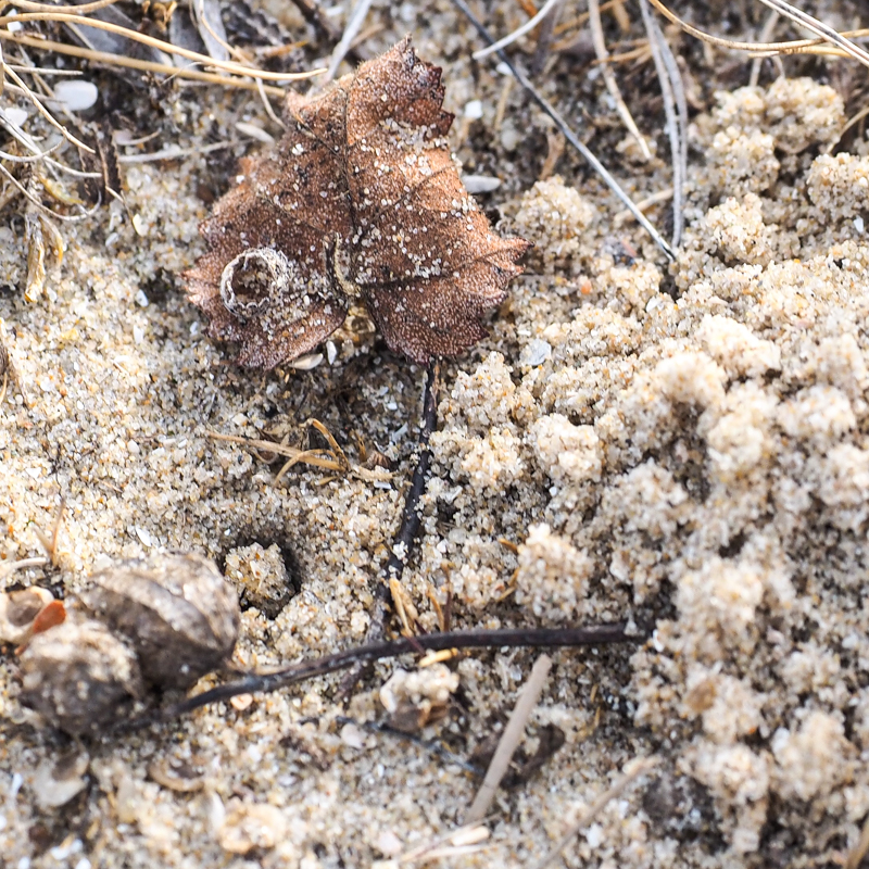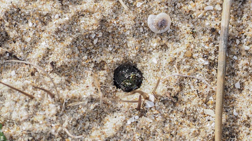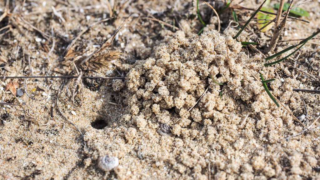 Wie heeft hier zulke mooie zandballetjes naast dit hol gestapeld?