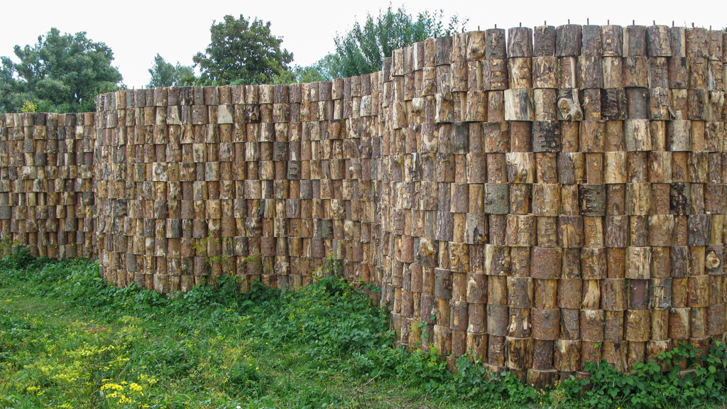 niet van hier gebakken klei-stenen, maar van houtblokken van vlakbij,