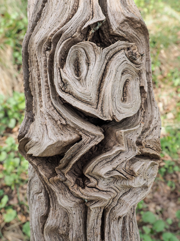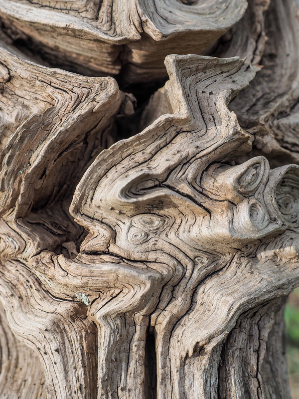 In dode maar nog stevig staande stammen heeft iemand totems gesneden,