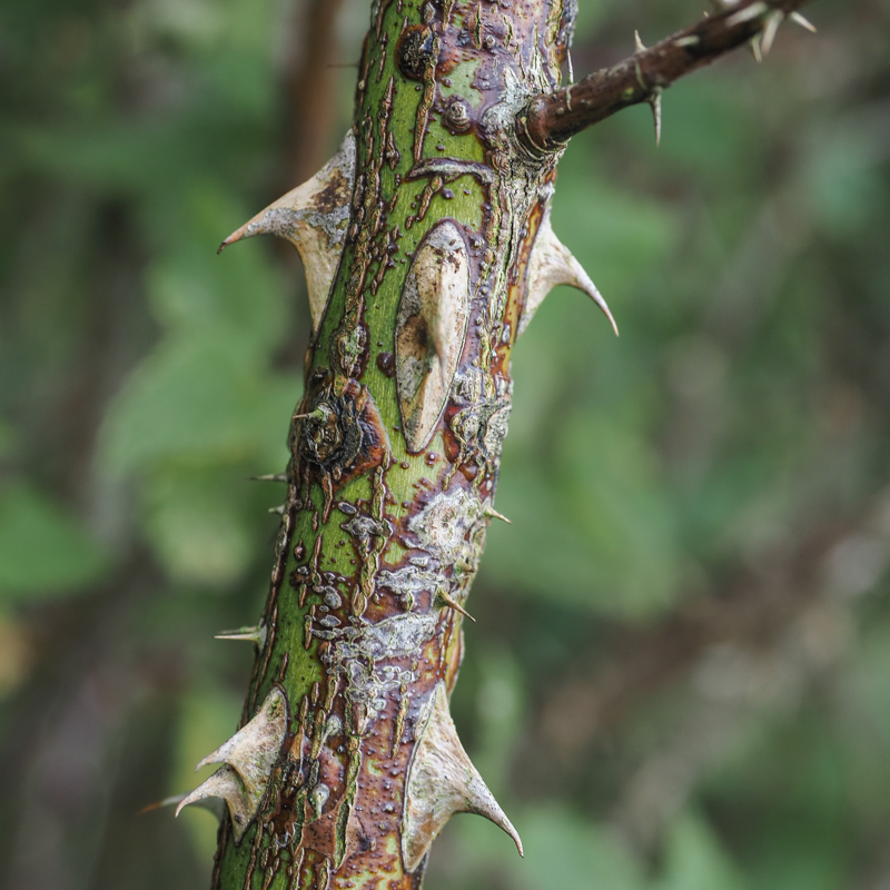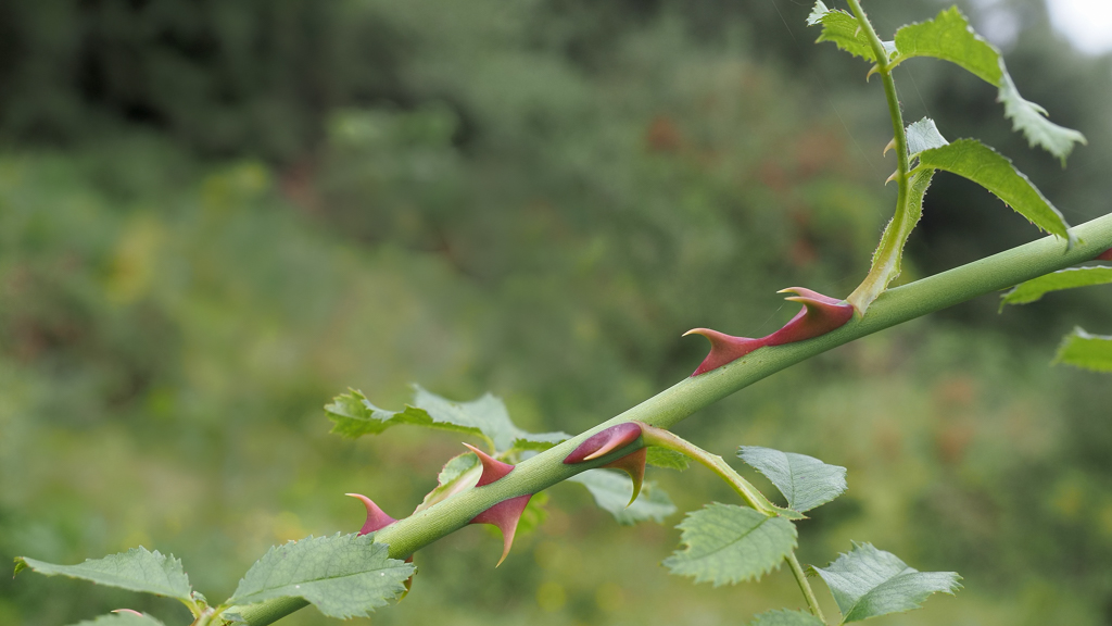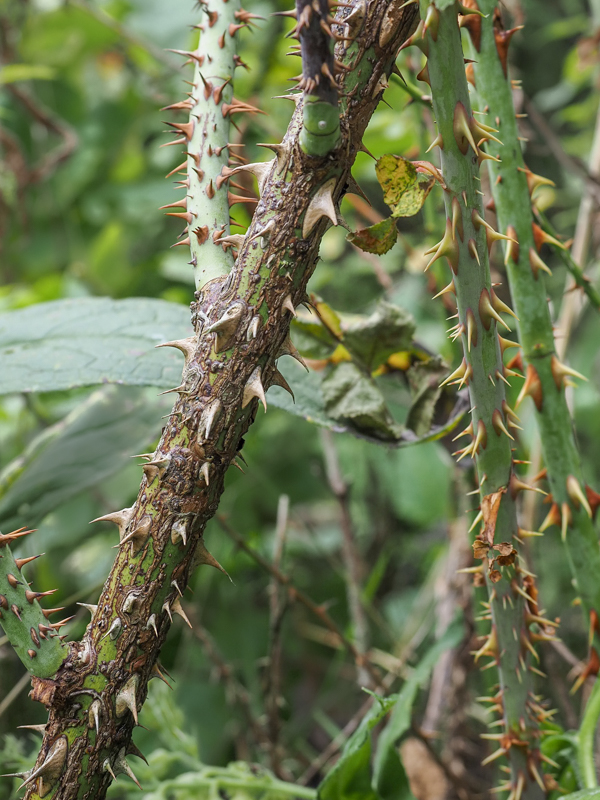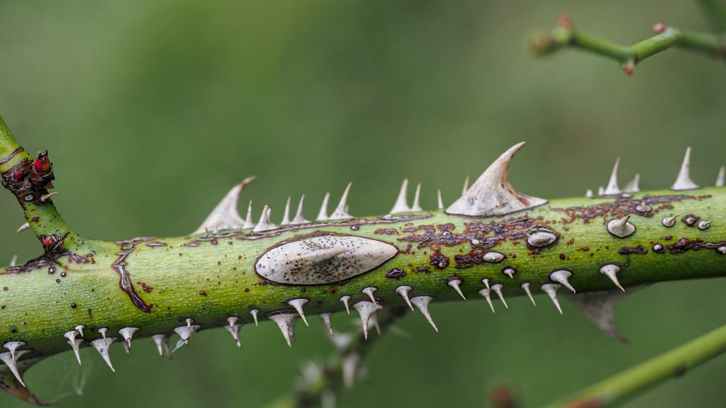 Zulke venijnige rode stekels op jonge takken van egelantier, en op oudere: