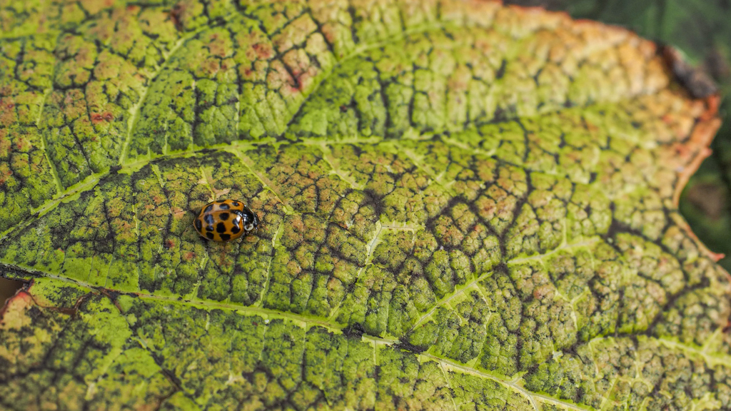 een lieveheersbeestje zoekt nog restjes honingdauw in de dieptes van nerven,