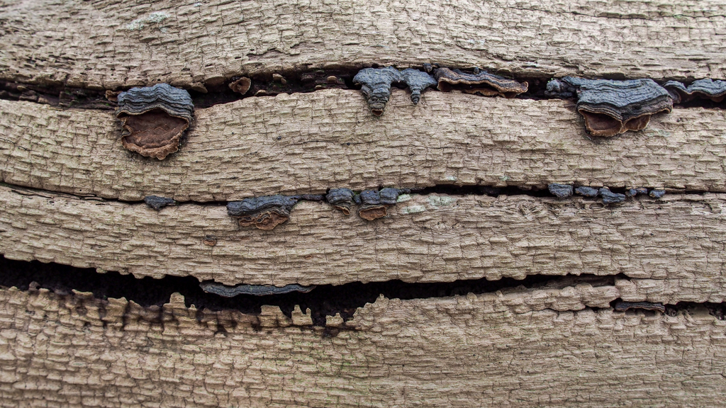 in het hout sierlijke spleten, donker en vochtig, waarin schimmels